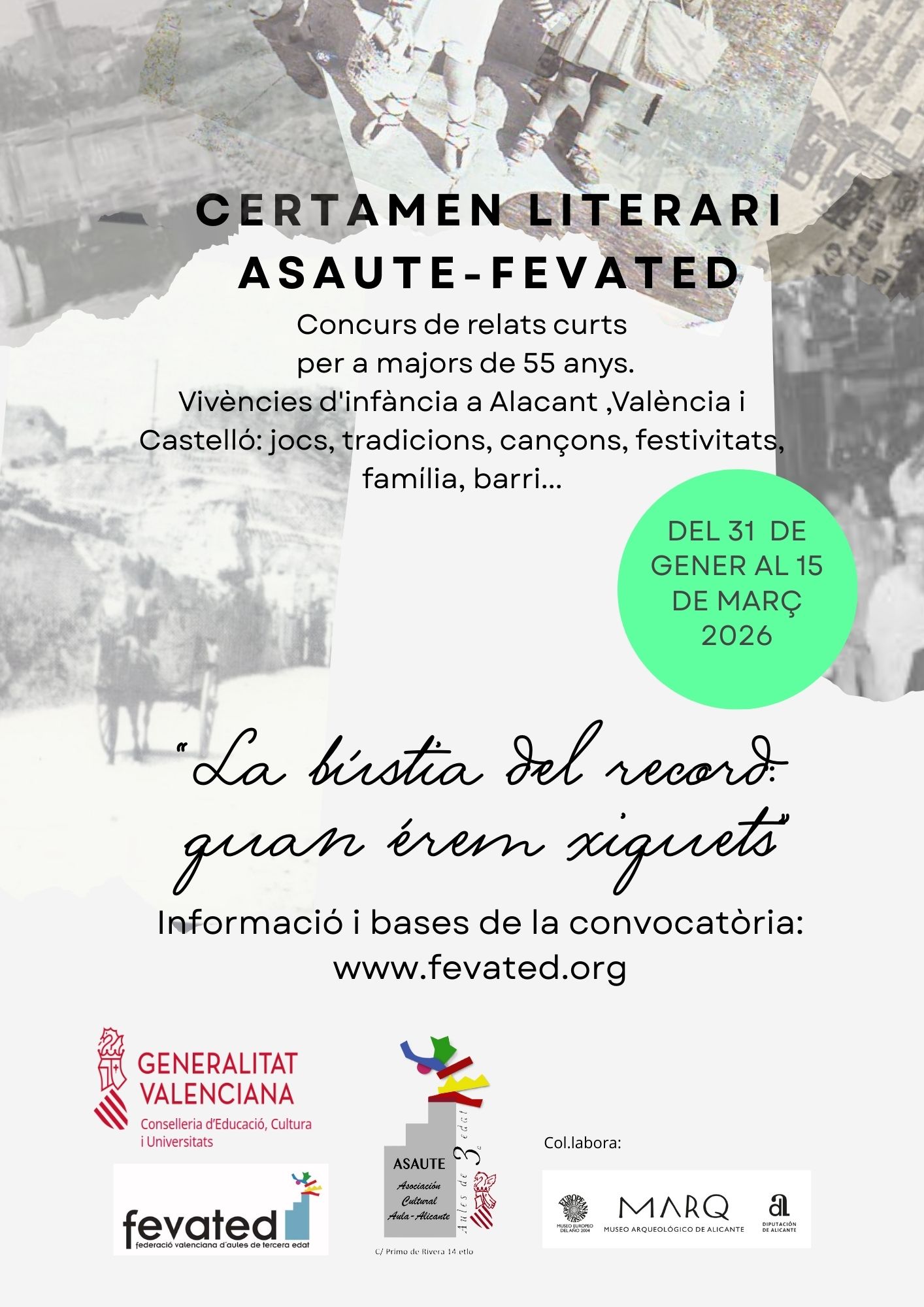 El Certamen Literario “El buzón del recuerdo: cuando éramos niños” abre sus puertas a todas las personas mayores de 55 años, nacidas o residentes en la Comunidad Valenciana que pertenezcan a las aulas de FEVATED (Federación de Aulas de la 3ª edad de la Comunidad Valenciana) y entidades colaboradoras e invitadas, con el propósito de recuperar, preservar y celebrar los recuerdos de la infancia vivida en cualquiera de las tres provincias valencianas: Alicante, Castellón y Valencia.